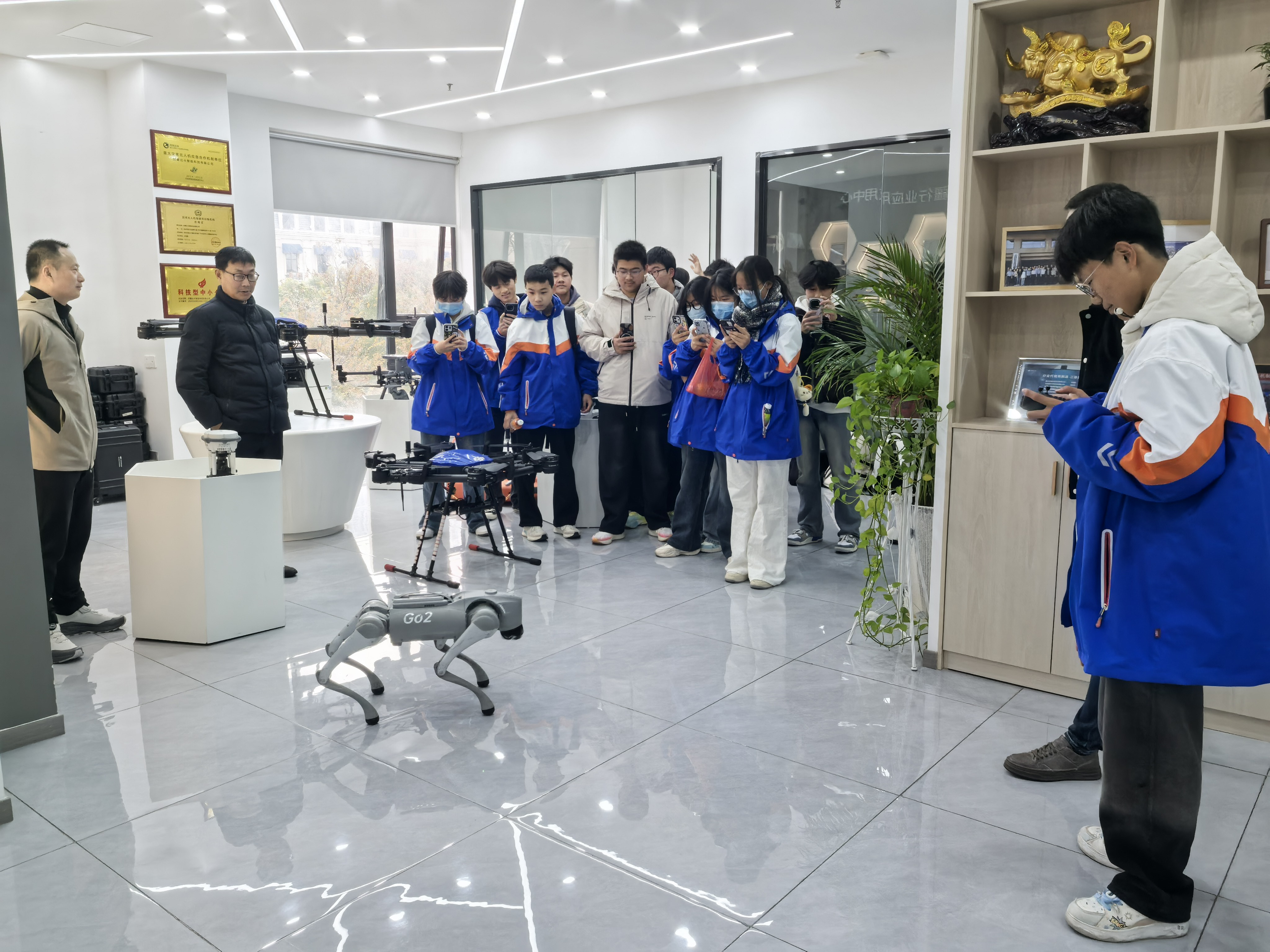 工程師現(xiàn)場演示了各類無人機、先進無人機平臺及智能機器狗等尖端設備。這些設備展現(xiàn)出的靈活自主運行能力與復雜環(huán)境適應力,引發(fā)師生們陣陣贊嘆,現(xiàn)場討論熱烈,大家近距離感受到了前沿科技的硬核魅力。